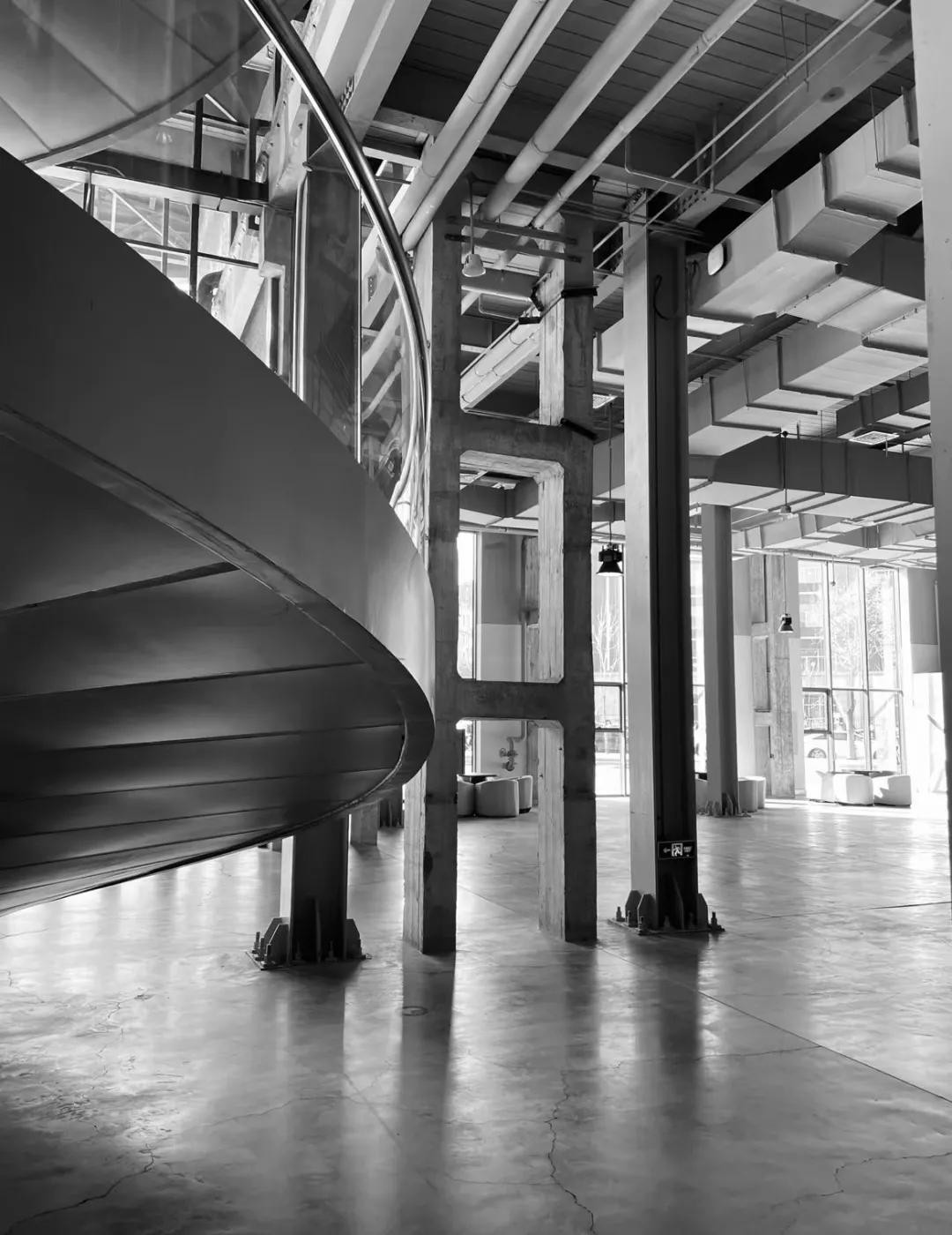 作为现代商业与艺术的集成式建筑,在空间结构的改造上有部分受限,设计时要思考结构与材质的合理性,同样也要保证充足的光线以实现整个空间的通透性。整个空间中,设计师强调了材质的质感,运用裸露的混凝土与钢材来展现建筑本身的粗犷之美,同时也表达着历史的原生性。