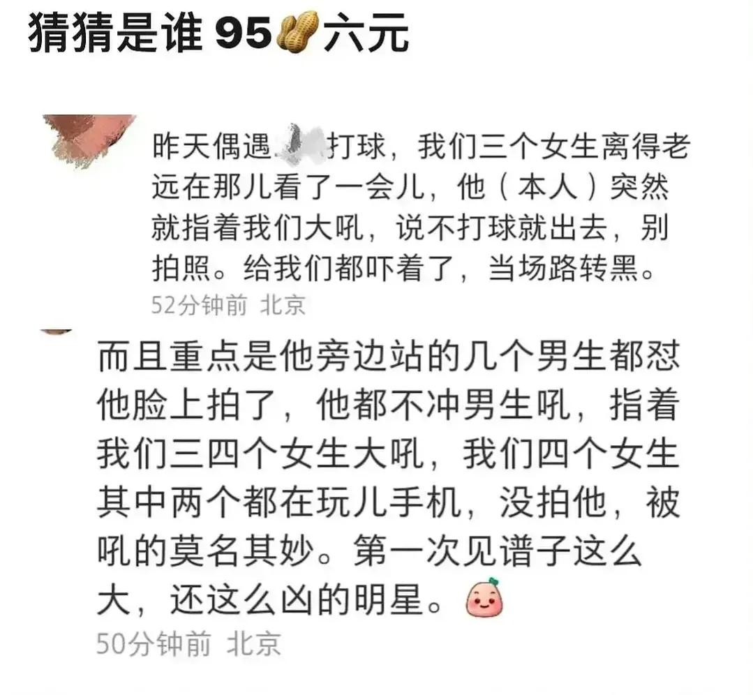 网友匿名发帖说偶遇95生(根据提示六元应该是刘昊然)打篮球,对场边女生大吼说不打球就出去,别拍照。重点是旁边有不少男生怼脸拍,他却不吭声。是觉得女生好欺负吗?网友没想到他私底下是这种性格,脾气凶,谱又大。所谓的绅士风度全是演技,当场明星滤镜破灭。