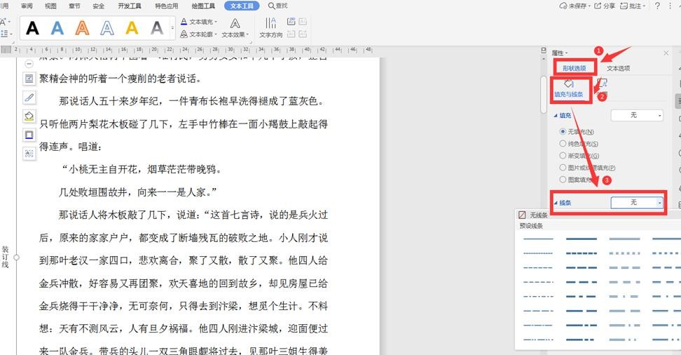 在右边弹出的对话框中,选择【形状选项】,继续点击【填充与线条】,在下方的【线条】选项中选择“无”: