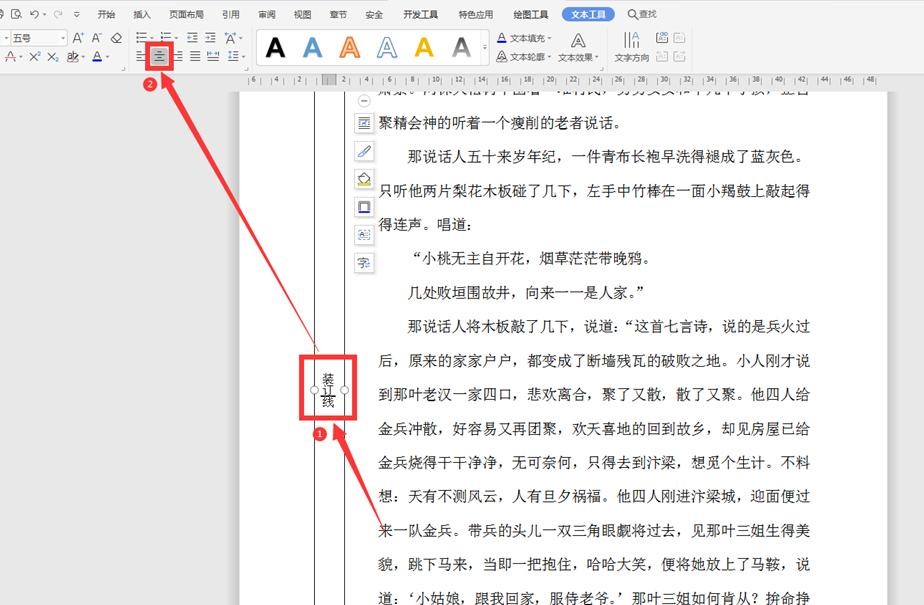 在文本框中输入“装订线”,并点击【文本工具】下的【居中】: