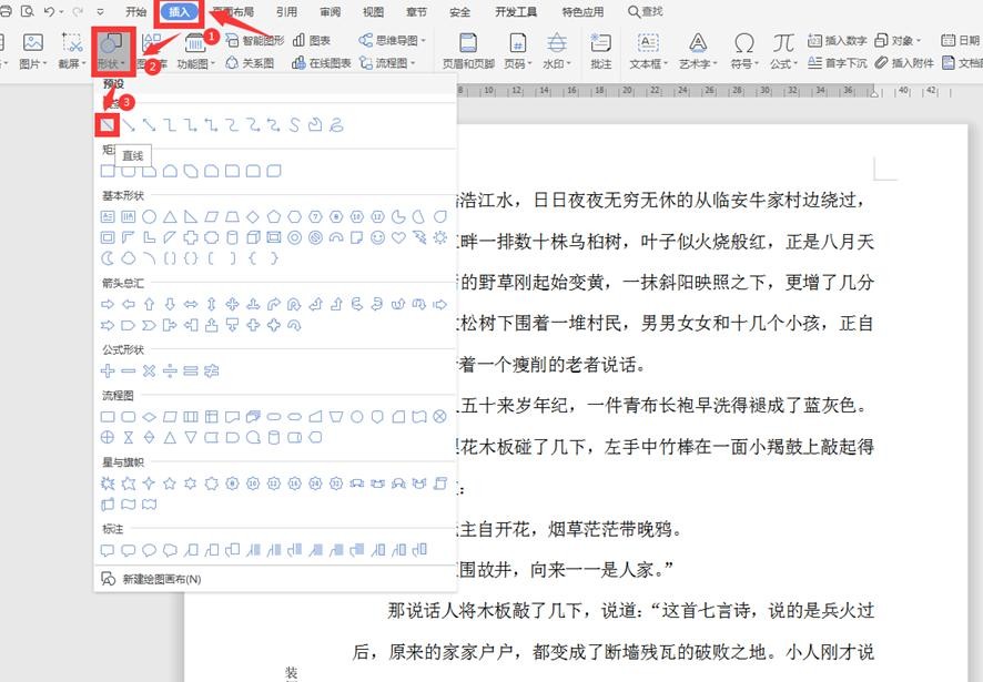 选择工具栏上的【插入】,下拉菜单中选择【形状】,在弹出的对话框中点击“线条”: