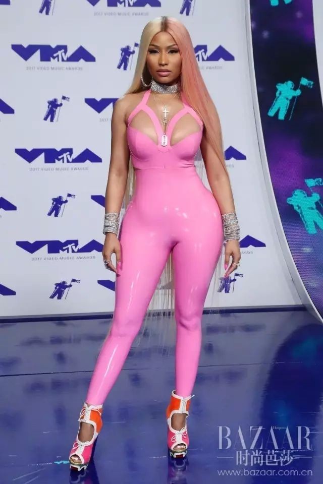 钟爱粉色的Nicki Minaj一身橡胶紧身衣裤,脚踩鱼嘴高跟鞋,头顶玫瑰金”拼色”瀑布长发,教你如何性感又不失优雅的360度无死角的白眼,表情包回来了。