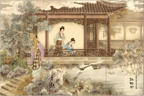 最早的《红楼梦》邮票发行于1981年11月20日与1982年4月24日,分为两次发行,全套邮票共有12枚,并附带1枚小型张。这套邮票采用了人物画形式,画面简洁,人物形象突出,特别是对贾宝玉和林黛玉这两个主要人物作了巧妙安排,绘制成了隽美的“双玉读曲”小型张。