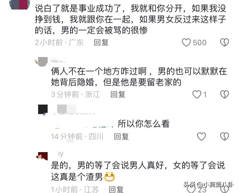 说白了就是事业成功了,我就和你分开,如果我没挣到钱,我就跟你在一起,如果男女反过来这样子的话,男的一定会被骂的很惨
