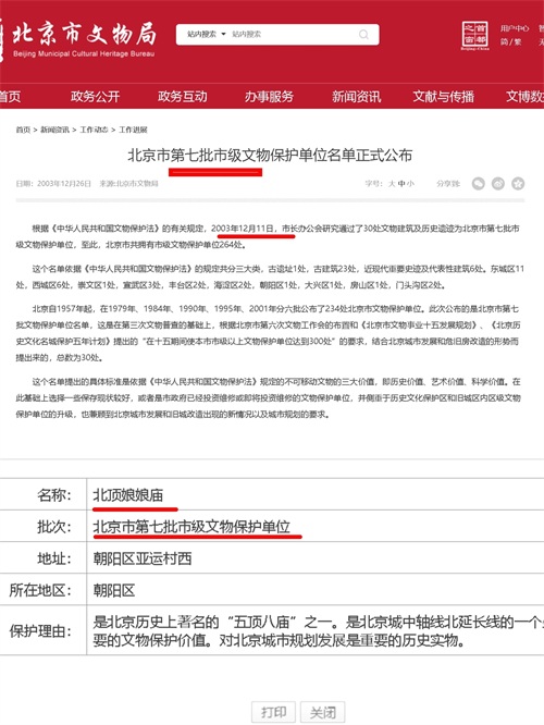 我非常好奇北顶娘娘庙做为一个拥有六百年历史古迹,在水立方建设时官方真的要把它拆迁了吗?于是去北京市文物局官网查了查,还真发现了一些蛛丝马迹。