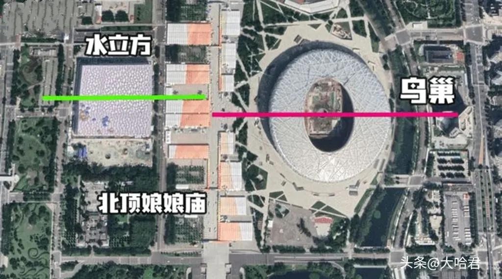 为了迎接奥运会,才规划修建鸟巢和水立方,在最初的设计图纸中,鸟巢和水立方都应该在北京的中轴线延长线北端中心附近,其四周的建筑物必须全部拆除,以留出更大的空间建造鸟巢及水立方,所以在这附近的北顶娘娘庙也在拆除范围之内。