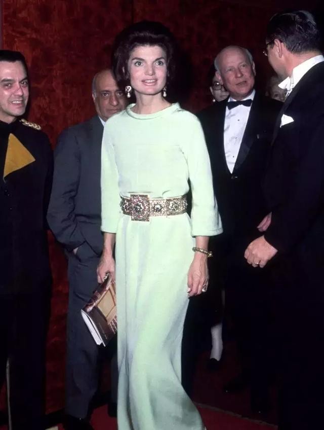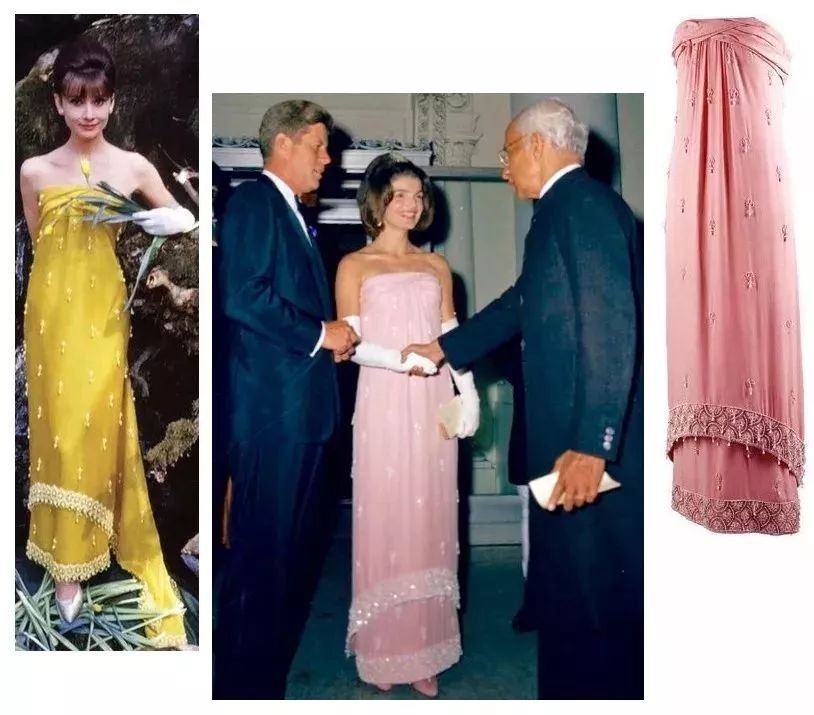 1963年,第一夫人把赫本穿的一件黄色简约的黄色晚礼服改良成粉色版,穿上不至于太跳脱,更能凸显第一夫人冷静超然的气质。