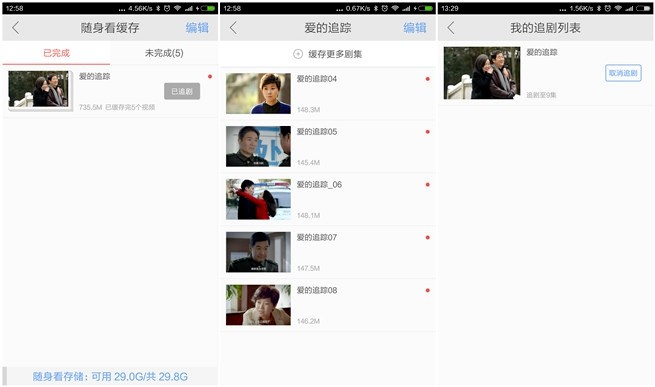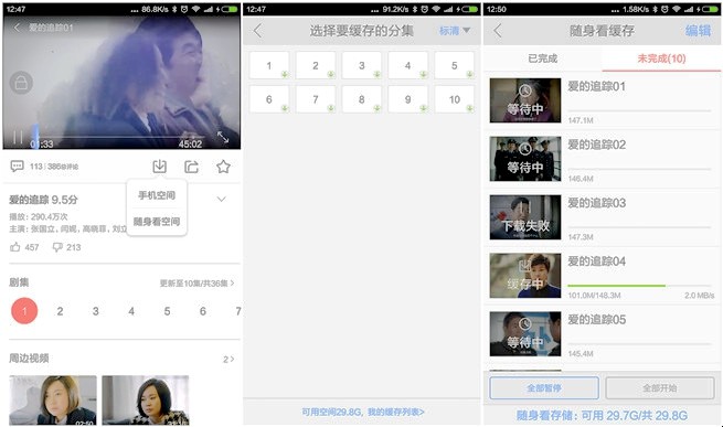 当在乐视视频中下载视频时,会提示让你选择下载到随身看中,还是手机当中,非常清晰,选择下载随身看中,再选择要下载剧集后,在设置了好之后,随身看可以完全脱离手机工作,只要在有wifi网络的情况下,乐视随身看可以自动同步剧集,将最新的剧集缓存到随身看里面,我们完全不用管它,非常方便和实用。在随身缓存页面可以看到它下载的情况,在追剧的页面可以看到我追剧的情况,非常贴心设计。