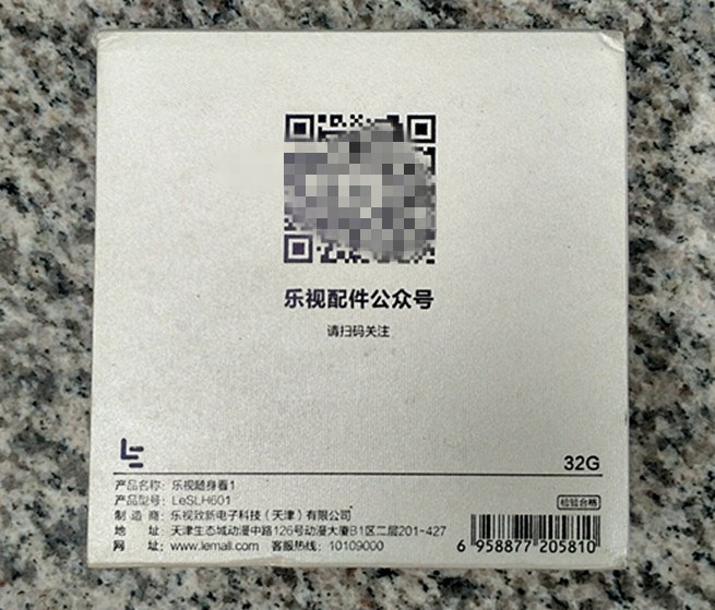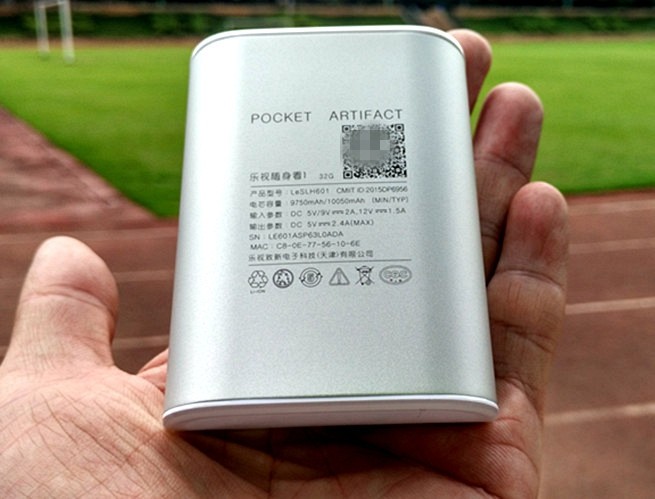 乐视随身看的背面镀有产品名称、型号、电芯容量、输入、输出参数和绑定乐视视频APP的二维码等信息。
