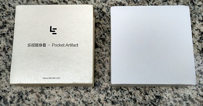 箱子的开箱方式是揭盖式,只要抓住箱子上半部分,下面那部分就缓缓地如水般流畅的打开,箱子打开后,发现乐视随身看穿着一件半透明的保护膜外套舒适地躺在箱子内。