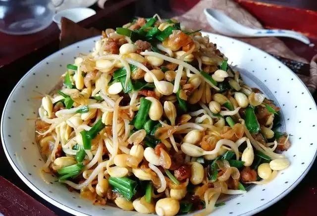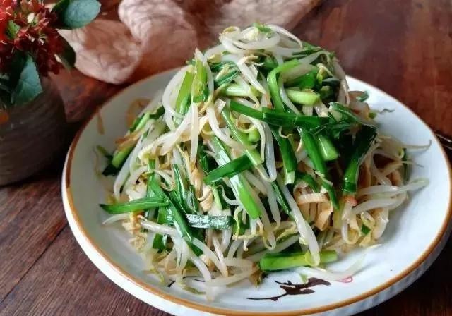 材料:绿豆芽250克、干豆腐3张、韭菜1把、油盐适量、姜2片、蒜2瓣 、米醋少许