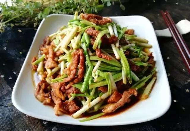 材料:蒜苗400克、猪肉150克、油盐适量、生抽酱油1汤匙、料酒1/2汤匙