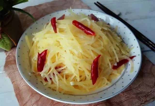 2.将切好的土豆丝放在清水内浸泡,洗去淀粉,捞出,在投洗一遍,这样土豆丝就不会发黑,炒制时不会发粘
