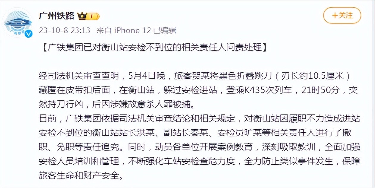 “广州铁路”公布了对衡山站长,副站长,安检员的追责后,强调要在全国范围内,加强案例教育,吸取教训,强化车站安检查危力度。