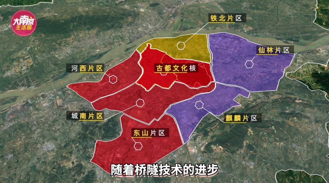 南京以前是一个沿江而不滨江的城市,大家熟知的主城就是位于江南明城墙内部的区域,而随着城市的快速发展,南京城市建设逐渐跨过高山与河流向外扩张,最终形成了今天的“一核六片”的格局。一核为古都文化核,六片为河西片区、城南片区、东山片区、仙林片区、麒麟片区、铁北片区。