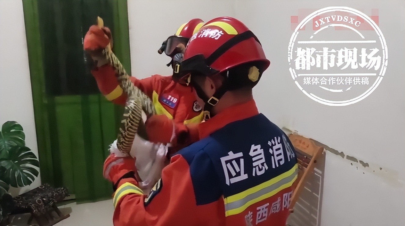 近日,在陕西咸阳,一保安室内竟然出现一条大蛇,消防救援人员立即赶到现场处置。