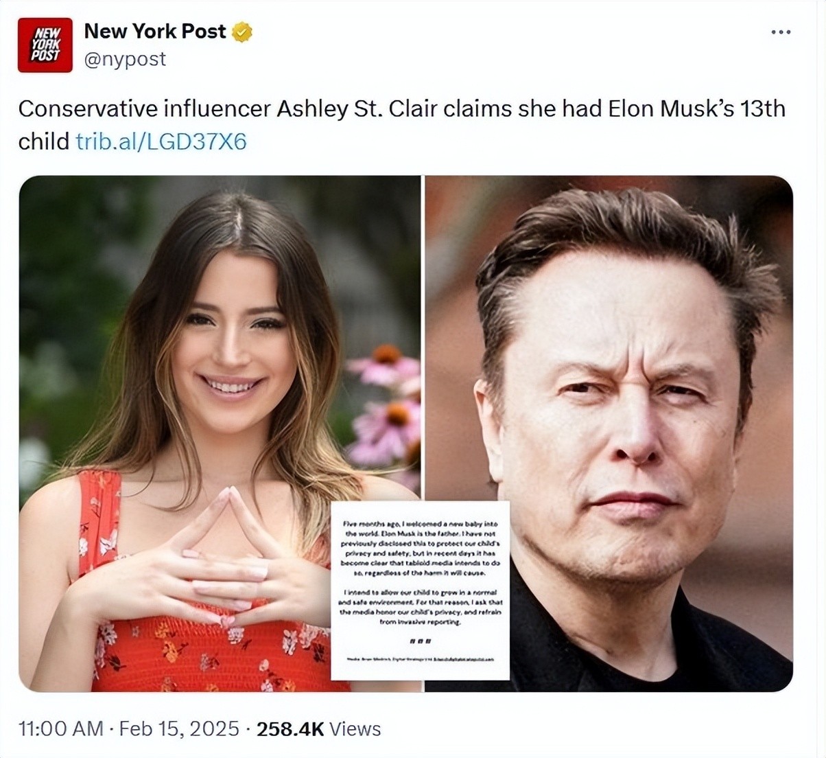 据悉艾希莉是美国的一名知名作家,她在社交平台上拥有超过百万粉丝,她在声明中称“5个月前,我迎来了一个新生命,马斯克是孩子的父亲,我此前未公开此事是为了保护孩子的隐私和安全。”