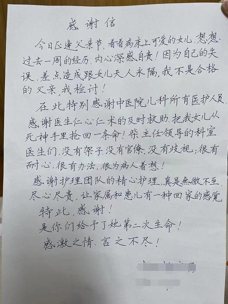 “因为自己的失误,差点和女儿天人永隔,我不是合格的父亲,我检讨!”在儿科病房陪护女儿的爸爸想起一周前的场景后悔不已。