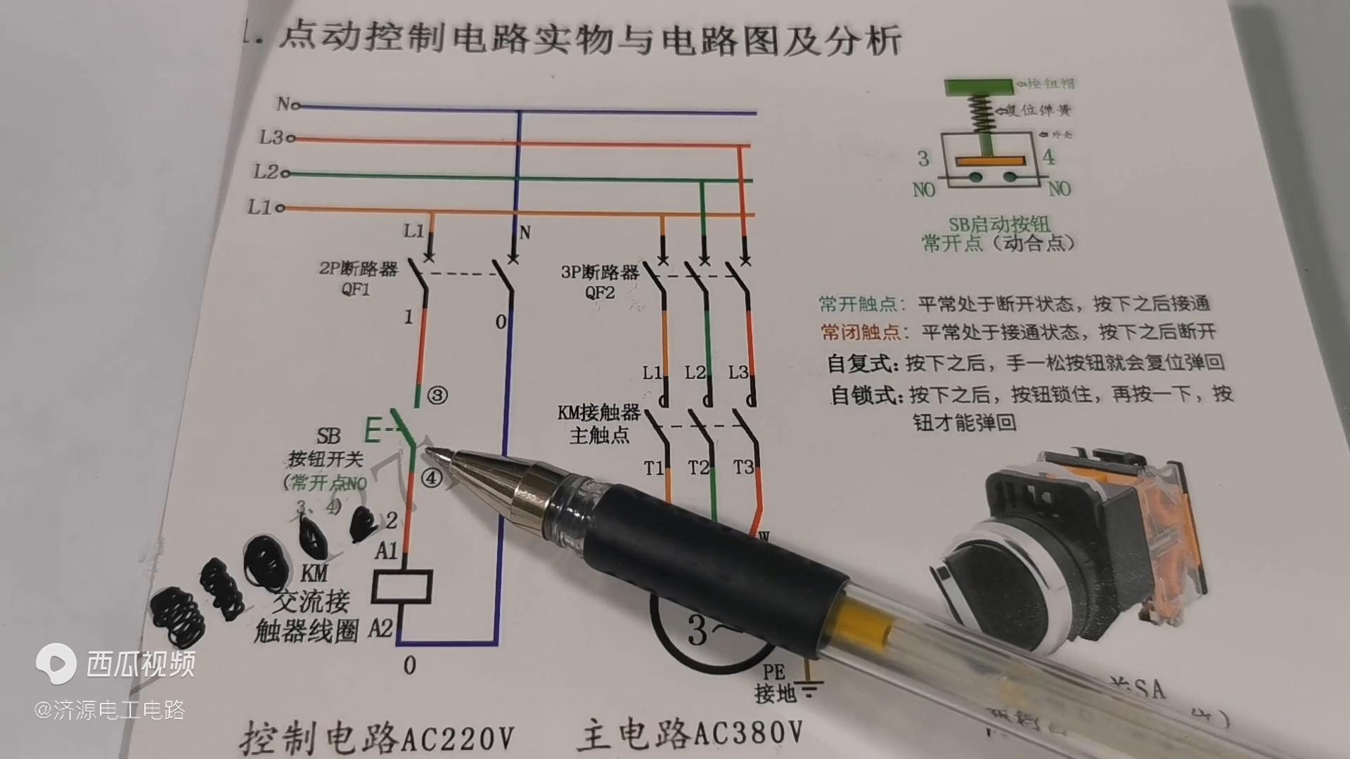 ·KM交流接触器线圈的得电线圈得电,主触电闭合,电动机开始工作,松开按钮以后停止工作。这是一个电动控制,也就是按下去以后工作,松手以后停止工作。