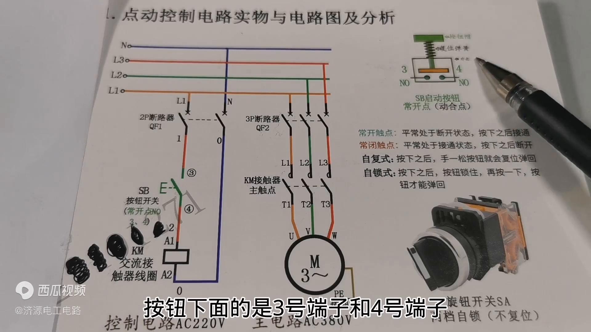 ·下来看一下它这一个按钮,这一个就是电路当中的电动按钮。看按钮上面这一个位置,可以用手进行按下去,在它的中间装的有复位弹簧。按钮下面的是3号端子和4号端子,也就是这一个位置3号端子和4号端子。