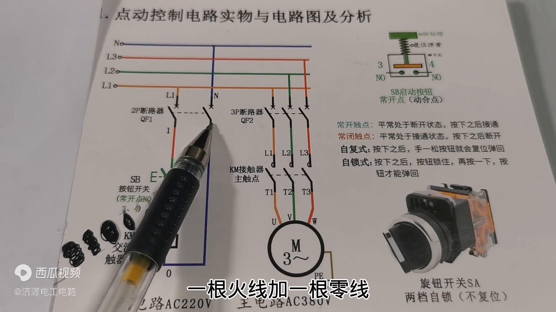 ·两p断路器下来以后,这一根火线直接进到SB,这是按钮开关长开点,这是一个长开点。