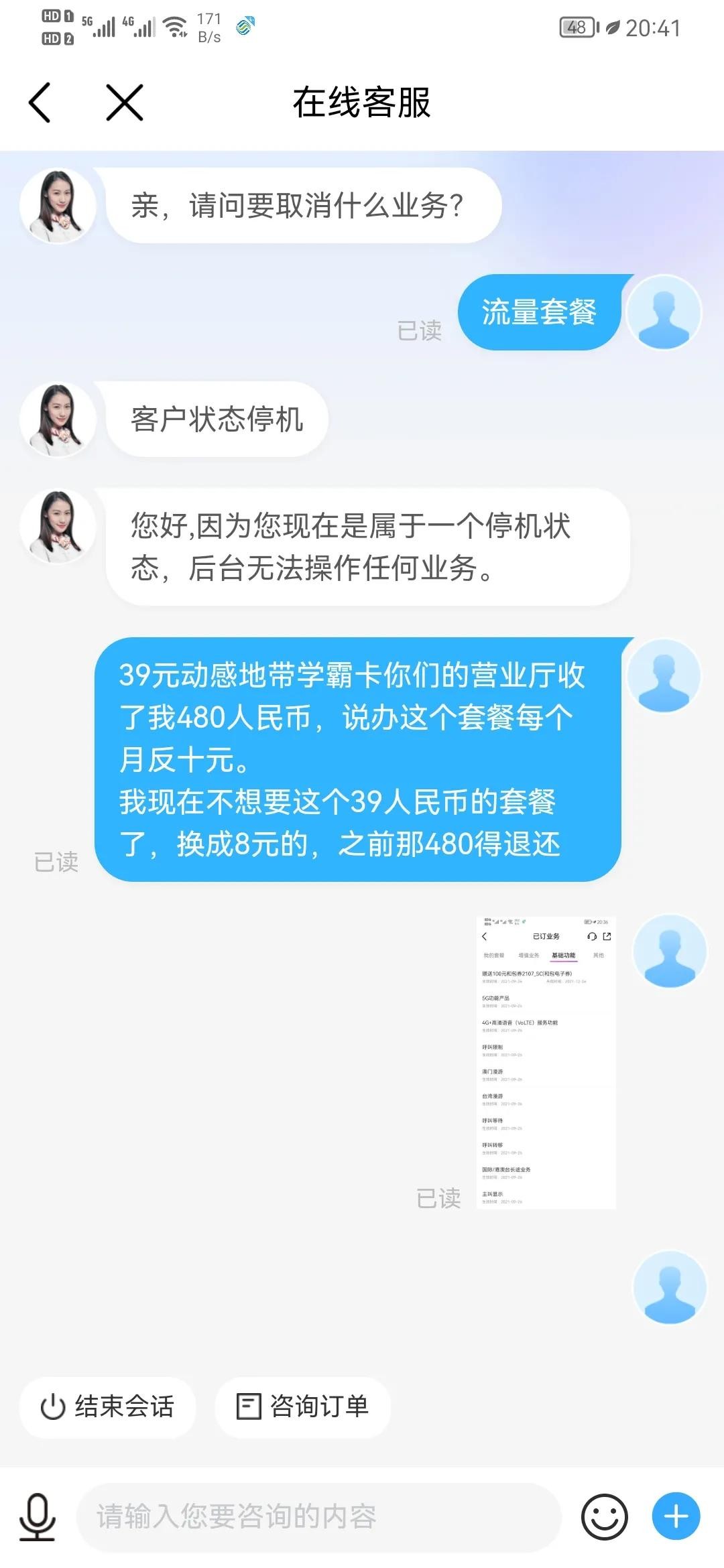 第一次打10086说查不到我的套餐费用,不给退订480。