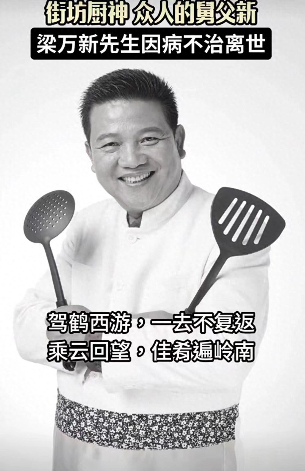 2024年9月10日,岭南“我爱翻寻味”节目公众账号发出噩耗,岭南美食家梁万新(舅父新)因病不治离世,享年66岁。