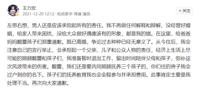 当天,他言辞恳切的道歉李靓蕾,并说暂时会退出工作,好好陪伴父母孩子。李靓蕾得来了她想要的答案,也是发文不会去告王力宏了,而王力宏也因此取消了b站的跨年晚会。