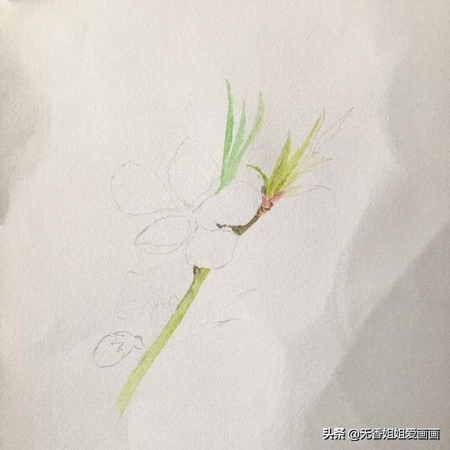 用浅绿色给枝干和叶片铺垫一层薄薄的的底色,等颜色稍微干一点之后,再用黄绿色叠加叶片,让叶片的颜色看起来更舒服一些。