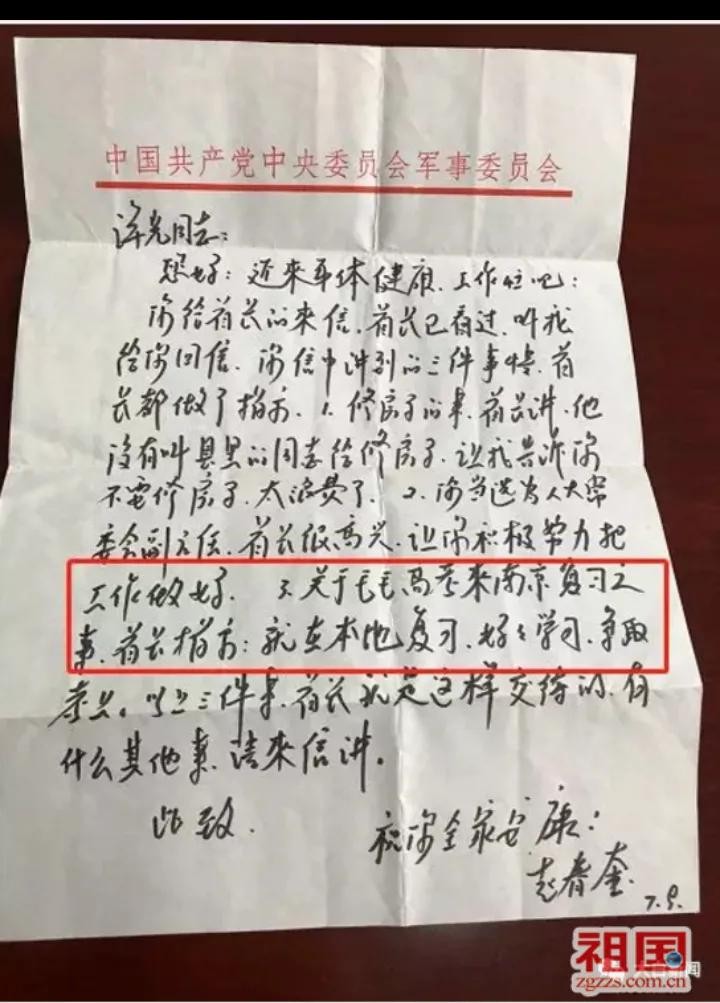 不久许世友收到了信,很快叫秘书回了信,其中是这样写的:“……,3,关于毛毛来南京复习高考的事,首长说就地复习考试,好好学习,争取考上。”