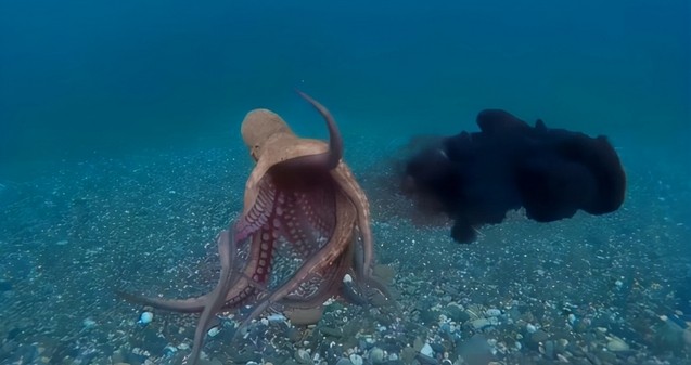 除了伪装外,巨型章鱼还有一个令人惊叹的捕食技巧:喷射墨汁。当巨型章鱼感到受到威胁时,它们会喷射出一种黑色的墨汁,制造出一个浓密的黑色云雾。这不仅使得周围的水域变得模糊不清,还能迷惑捕食者的视觉,为巨型章鱼提供了逃脱的机会。这种策略类似于一个烟雾弹,为巨型章鱼提供了宝贵的时间来逃离危险。