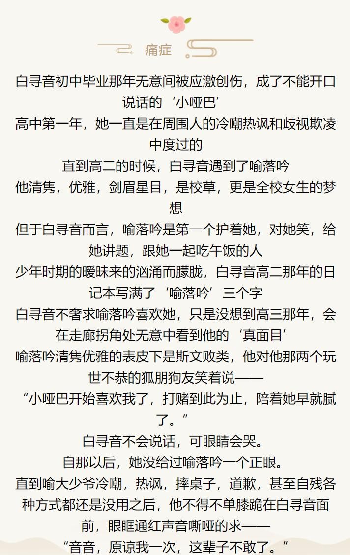 这本我真的大爱,火葬场的火候很够,最主要是女主的性格真的超棒,冷静淡然,一点都不扭捏。喻狗和小白的生活也很甜,看完超满足。
