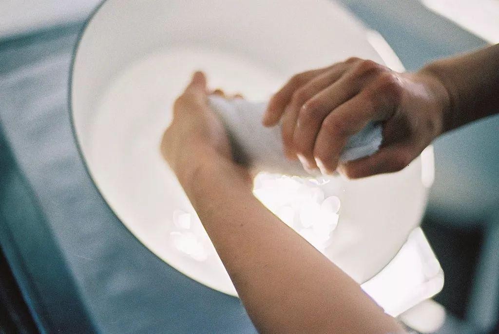 2.将一条干净的毛巾放入温水里浸湿,拧一下,稍微保留一些水分。