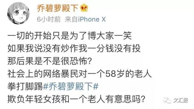 经历直播露脸变大妈后,29日,女主播“乔碧萝殿下”首次现身,在直播中哭诉自己遭受网络暴力,称自己没有任何违法乱纪的行为,希望大家能善良一些。并且她在发布微博抵制网络暴力的同时,也暗示了这次的直播事故是一场有预谋的炒作。
