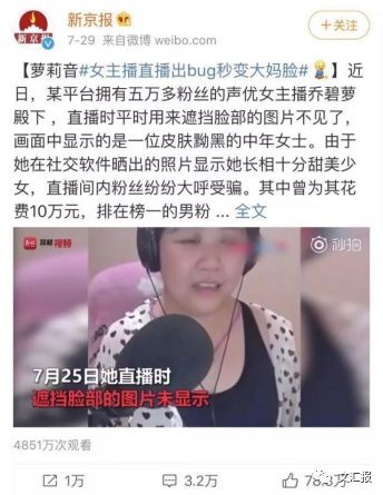 7月25日,这位斗鱼主播的变脸事件引起了网络上的轩然大波,话题#女主播直播出bug秒变大妈脸#成为微博热搜,至今已有7.4亿阅读量。