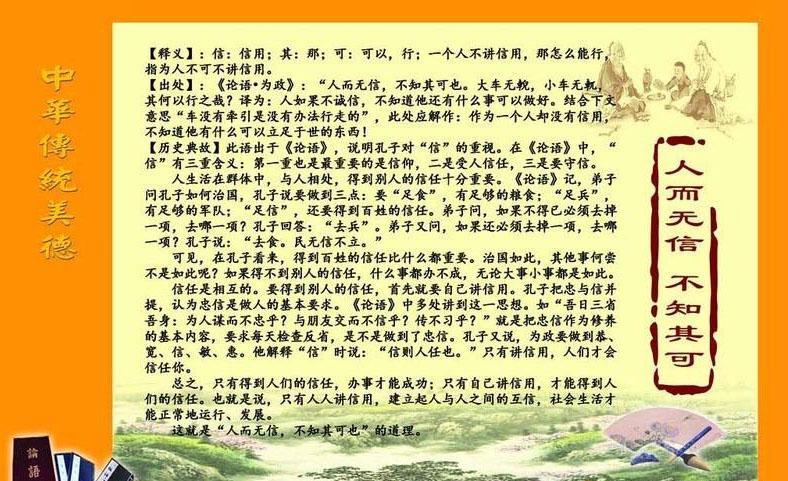 言而有信,需以诚为先。信者,人言也。诚者,言成也。出言必成,其言方信。出言不诚,其言难信。中国自古就将“信”视为立身之本、处世之道。孔子云:“人而无信,不知其可也”。《周易》有言:“人之所助者,信也”。在个人家教方面,有曾子杀彘教育其妻子欺骗人者必将失信;在国家兴盛方面,有商鞅立木以兑现重金取信于民,使改革法令得到有力推行。从这些耳熟能详的事例中可见,守信,时时处处都发挥着重要的作用。