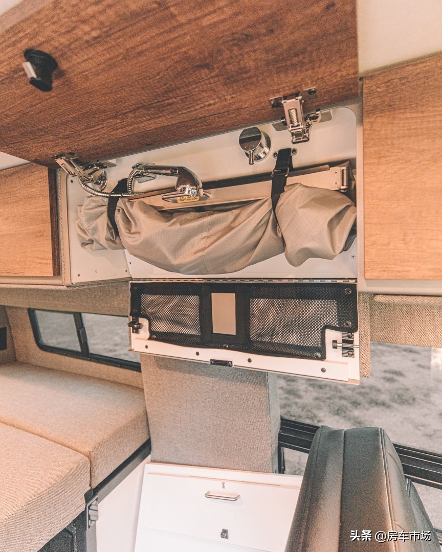淋浴部分是隐藏式的,放置在吊柜中,打开吊柜可以放置浴帘进行淋浴,还配有便携式马桶。车外有一个外部淋浴喷头,可以在进入车内之前清理干净。可以看出越野性能强的车型反而没有固定的卫生间,车内布局非常简洁。