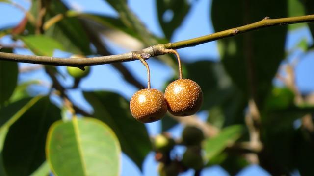 这些黄豆大小的果子叫杜梨,虽然果实是小不点,但是杜梨树木却很高大,树木高达10余米,树皮灰色,密布纵向裂纹,细枝褐色与果实颜色相近,并且附生出很多的小尖刺,叶片边缘像锯齿,它们是我国广泛分布的最不像梨子的原生乡土梨树品种!