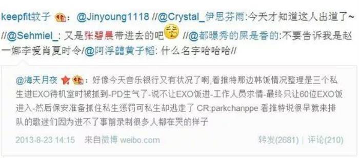 还有她和中国EXO四大私生饭一起去宿舍楼下蹲点,发微博的这位算是把这几个圈内最大私生饭数全了。