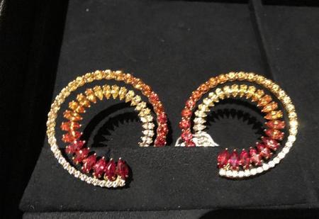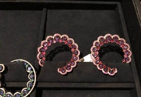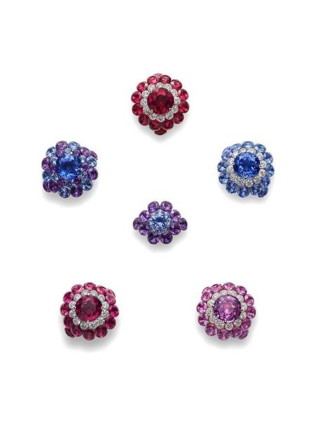 同时推出颜色鲜艳的款式,其中一款镶嵌紫水晶、红碧玺和粉红色蓝宝石;另外一款则镶嵌总重达23克拉的多颗彩色蓝宝石,营造渐变橙黄色效果。