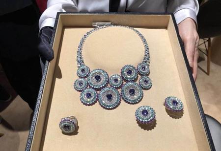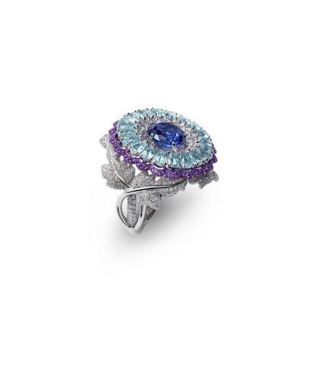 一套由项链、戒指及耳环组成的珠宝套件:心形切割坦桑石、帕拉依巴璧玺、紫水晶及钻石,与18K白金和钛金属圆环搭配。本年度Red Carpet系列以心形切工和彩色宝石为亮点。