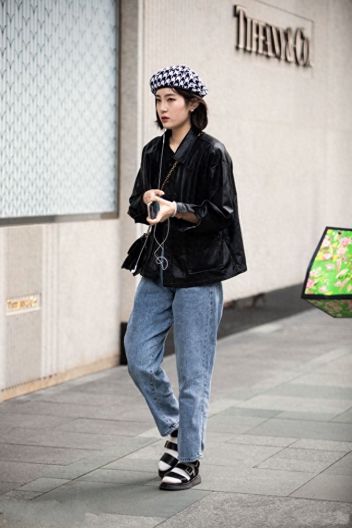 这身穿起来非常的帅气,很飒的感觉,中性风的皮衣搭配宽松的牛仔裤,头上戴黑白色的针织贝雷帽,脚踩黑色凉鞋,一身暗色系的穿搭,显得整个人都是酷酷的。