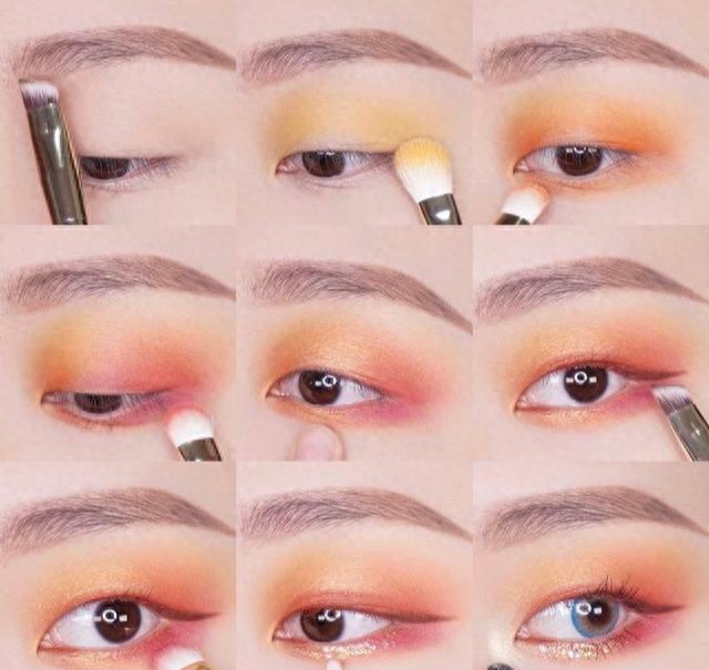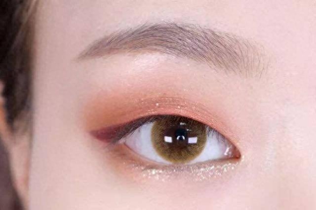 蘸取浅棕色的眉粉对于眉形和眉尾进行晕染填充,浅黄色作为眼部打底,橘色做二次晕染,紫红色加深眼尾部分,珠光色在上眼皮中间和下眼皮的前端进行提亮,选取深色的眼影作为眼线,最后修饰细节,戴上美瞳放大眼睛,涂上睫毛膏,一个好看的元气单眼皮眼妆就化好。