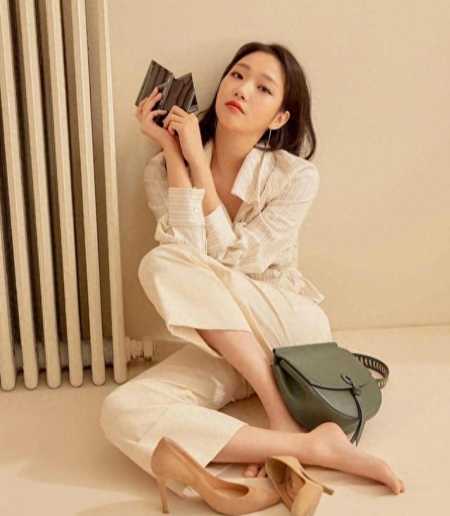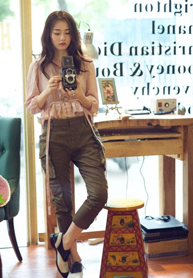 柴碧云这套文艺写真服,一眼看上去夺人眼球,七分袖的粉色衬衫,收腰的设计将好身材凸显出来,深棕色的工装裤又有一点帅气,复古的黑白拼色英伦凉鞋,整套衣服看起来,文艺复古,随意的摆弄着相机,非常的具有知性美。