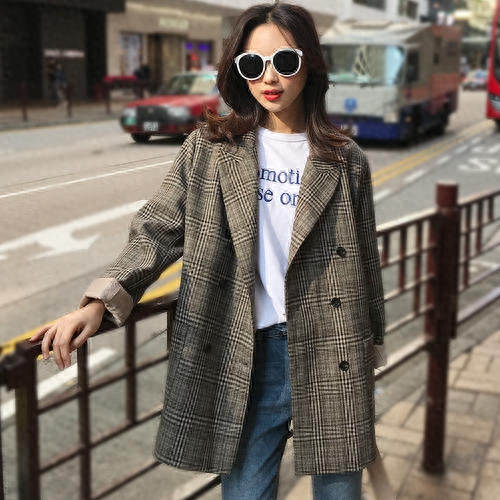 白色T恤,搭配修身牛仔裤,外搭一件中长款的灰棕色格纹西装外套,整个人看起来非常干练,再搭上一副墨镜,你就是街头最靓的美女!