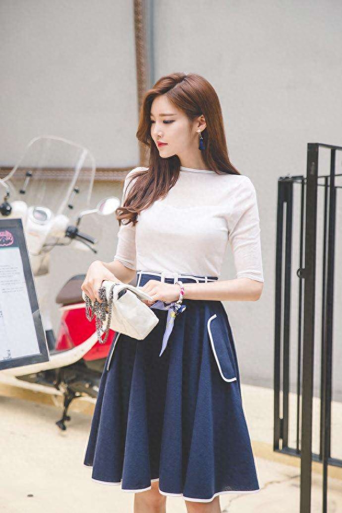 白色与蓝色相撞,总能产生不一样的火花,这套搭配,优雅中透着干练,简单中透着大气,腰封的位置上移,将整个腰线拉高,下半身的比例增加,从视觉上显好身材。