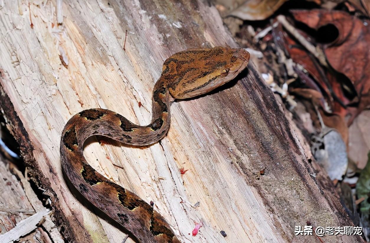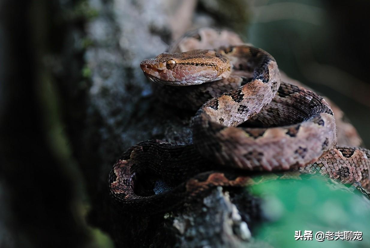 这货叫做乡城原矛头蝮,是横断山区特有的蝮蛇,分布在四川、云南等地。其体长在一米左右,棕褐色的鳞片是它最喜爱的外衣。