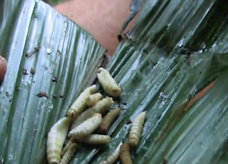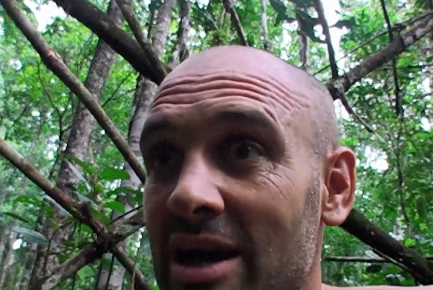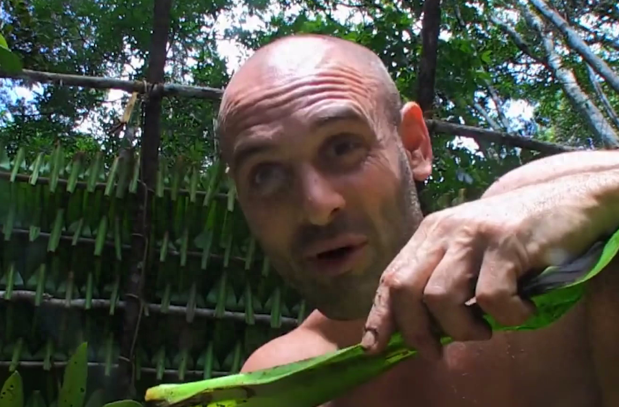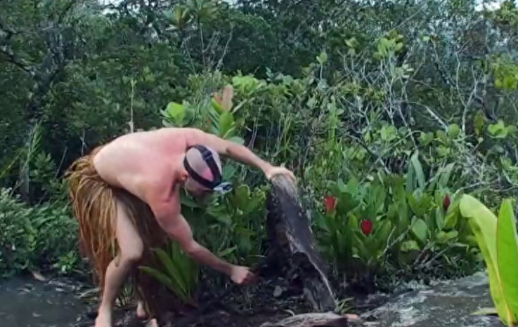 就说让你别吃那么快,没办法,又得重新觅食了,他打算做个捕鱼陷阱,摘不到棕榈叶没关系,他直接把树放倒了,真是个狼灭。