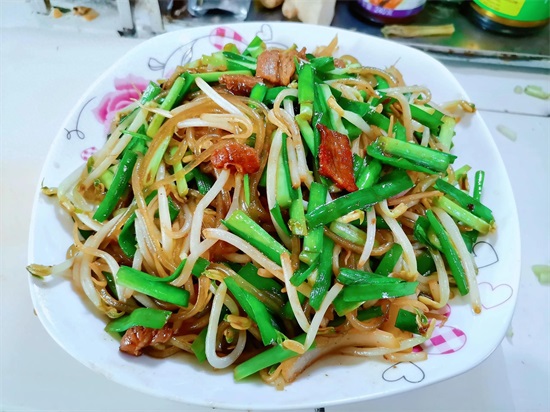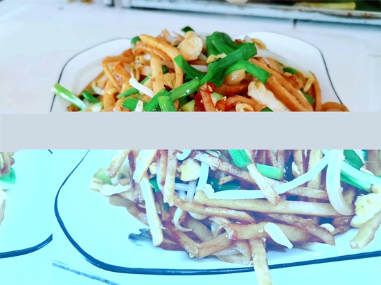 注:尽量用不粘锅来炒,因为饼丝容易钉锅,要适量加一点热水来补救,这菜要灵活掌握,做好了也是一盘美味佳肴。
