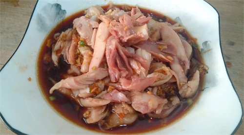 3.调料汁和鸡肉拌在一起入味即可装盘。